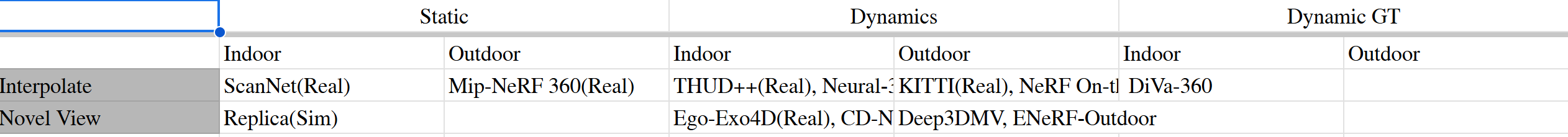 - Tooling gap: Novel-view evaluation across indoor × outdoor × dynamic regimes is rare; Tartan-Dynamic bridges this gap.