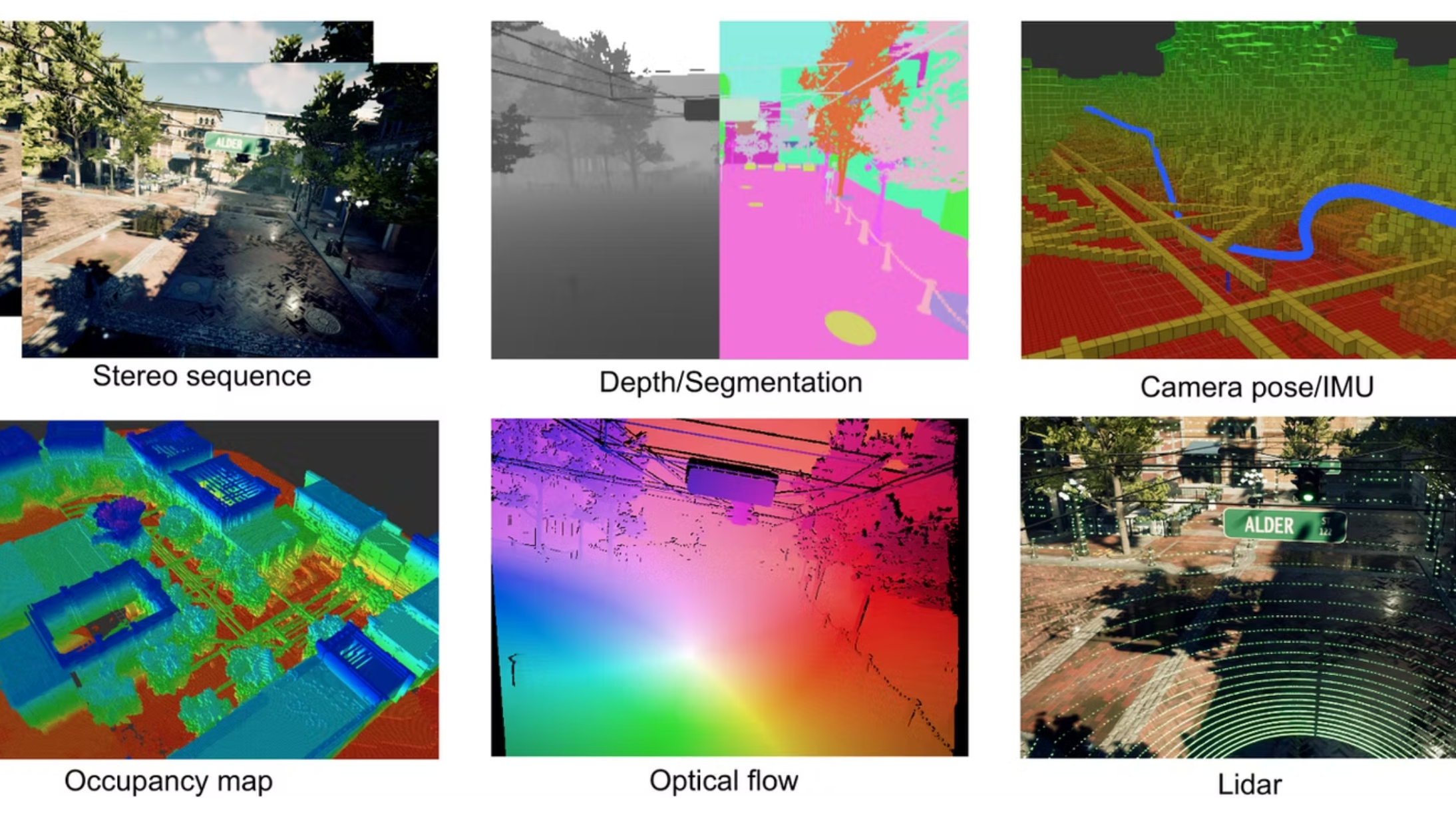 - UE 4.27 + AirSim generates RGB/Depth/Seg/LiDAR.